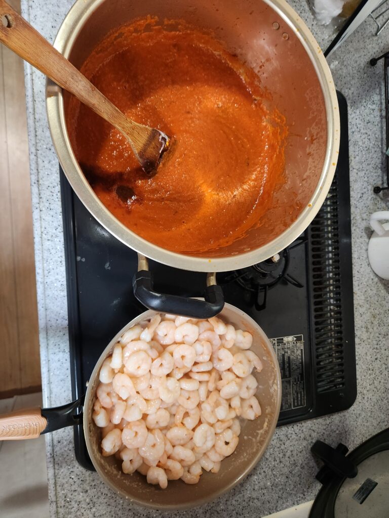 ⑥海老を別の鍋で炒め、炒め終わったらカレーに投入